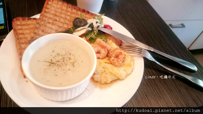 我們點的是當日特餐-某某炒蝦 跟 起司歐姆蛋+培根