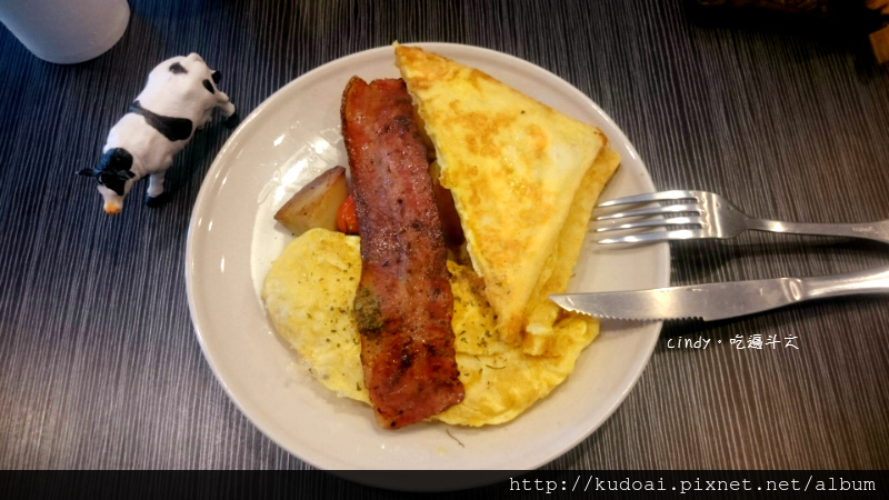 法式煎蛋吐司+煎培根+起司歐姆蛋+躲在下面的番茄跟馬鈴薯塊